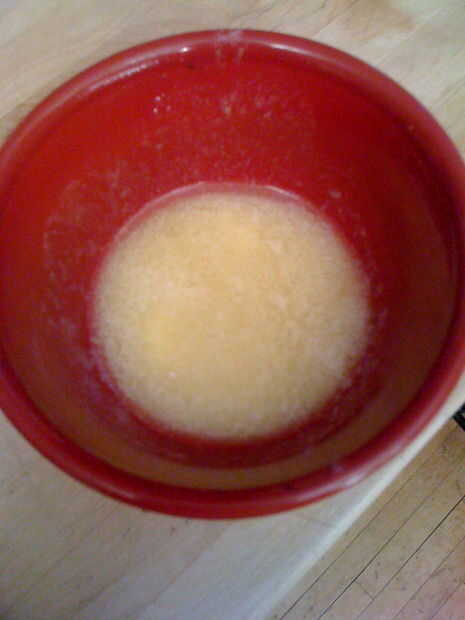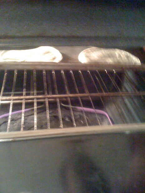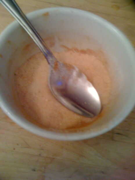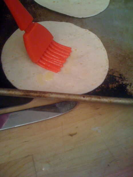 Tomar 1/4 de una barra de mantequilla y derretir en un bol. Utilice una cuchara o una goma para cepillomantequilla en ambos lados de las tortillas. La siguiente foto muestra el azúcar de canela que hice. Usaremos más adelante. Ahora poner las tortillas en el horno a 350 grados hasta que se parecen a esto: