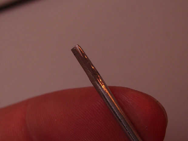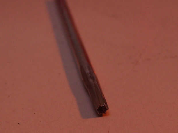 Lo que queda es presentar las muescas. Para esto tengo el cable entre mis dedos, por lo que puedo alinear fácilmente el archivo y no. Trate de mantener las muescas de centrado en las caras y acaba de obtener cada uno comenzó. Luego profundizarlas todo alrededor. Conseguir que al ajustar los tornillos lleva un poco de paciencia. Por lo menos Torx tienen cierta redundancia, si algunas de las alas son menos pronunciadas, probablemente todavía funcionará.