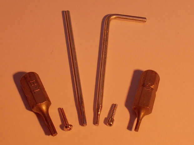 Con todo, el Torx es probablemente más adecuado para este método. Aunque parece más difícil, es más indulgente en funcionamiento, una vez que se adapta. Para la llave de Allen, el margen entre conexión y deslizamiento es muy pequeño. El metal suave utilizado aquí también facilita el apriete demasiado los tornillos, dañando el destornillador. Si eso sucede tienes que presentar el área dañada a... Un upside a esto es que es casi imposible dañar los tornillos propios. Un gran plus al intentar quitar los tornillos ahuecados.