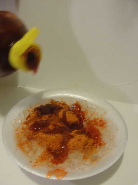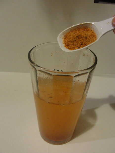 Mezclar los ingredientes. Squeze dos limones en un vaso de agua Añadir 1/2 de cucharadita de sal. 1/2 cuchara de Pico De Gallo. Agregar 1/2 tabla de los polvos lucas (Tajín).