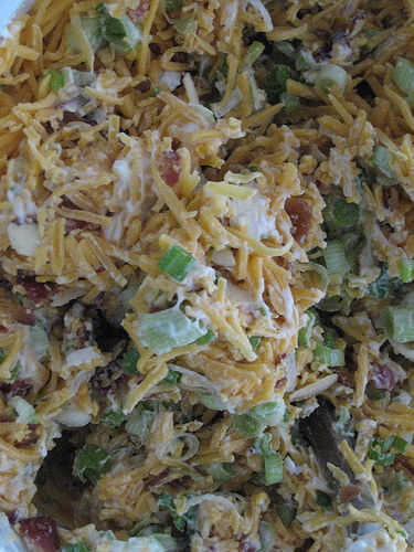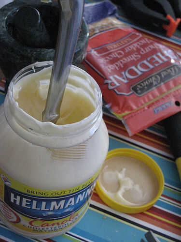 Añadir suficiente mayonesa para atar y sujetar todos juntos, pero no demasiado para hacer Aguada. Normalmente, yo uso aproximadamente 1/4 de la jarra, más o menos.