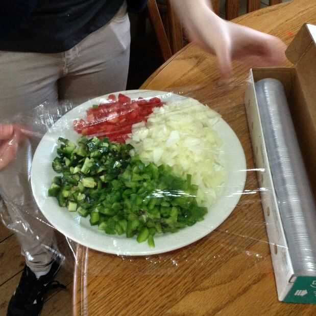 Una vez que se cortan todas las verduras, ponerlas en un bol o en un abrigo de saran de placa y lugar en la parte superior.