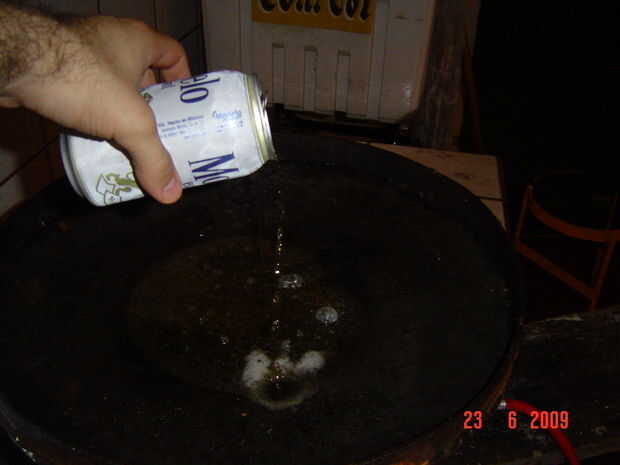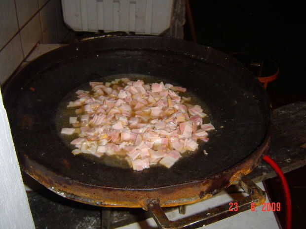 Encender la hornilla de gas conjunto en un low(ish) le llama no queremos que caliente y agregar una cerveza a la discoteca (de la misma cerveza su bebida), y a esto se añade el tocino y dejar cocer a fuego lento por un tiempo, cuando ha sentado un rato en la cerveza (5 a 10 minutos) tomar el tocino de la cerveza y sólo mover así al lado de la discoteca se releasesome grasa y seguir cocinando en el lado.