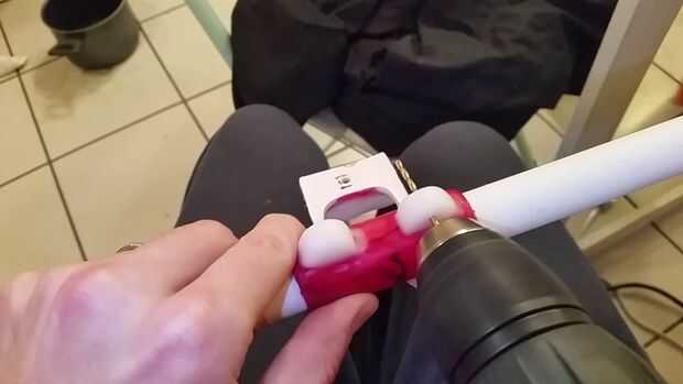 Fije la pieza E, recuerde que no está centrada en el tubo pero funciona al ras con la parte posterior de la tubería como viene.