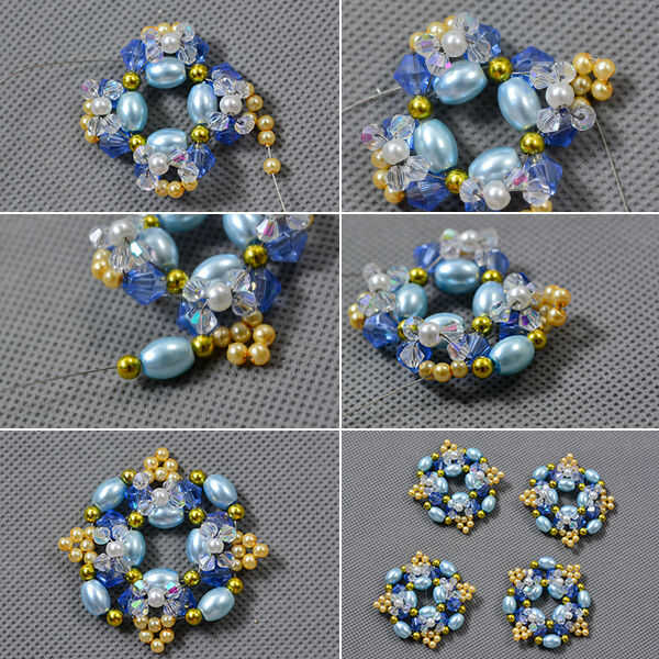 2 º, continúan Deslice dos cuentas de bronce y un grano de arroz azul perla y luego pase el cable a través de otros tres perlas amarillo;