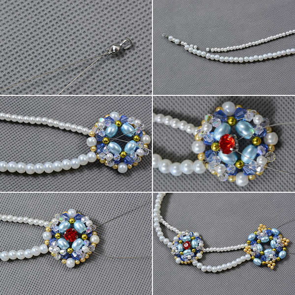 4, repetir lo mismo para conectar las cadenas de perlas con flores de abalorios.