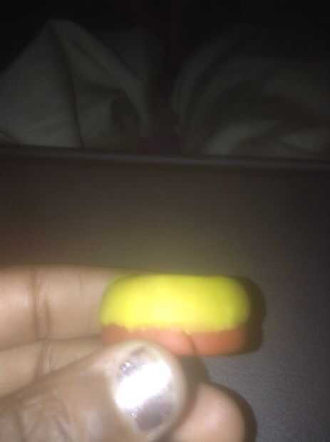 Rollo de otro color de la arcilla (las minas es de color amarillo) en un piso del círculo y se coloca sobre el donut. Si desea, puede formar la guinda. También puede utilizar un molde de círculo como el dispensador del toothpick utiliza.