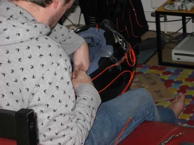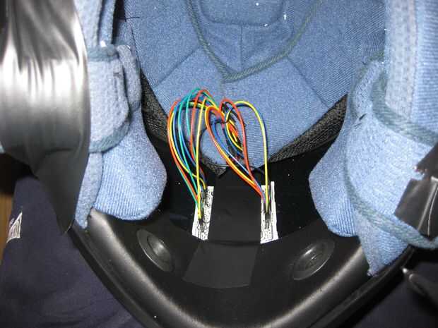 Pegué la batería en la parte posterior del casco con alguna cinta simple electricidad negro mate. Llevó a cabo bien y duró toda la noche. Corte un par de pequeños agujeros en la base posterior y roscado el comienzo de El alambre de la invertida, a través de los agujeros y luego nuevamente hacia fuera, al ancla en el lugar.