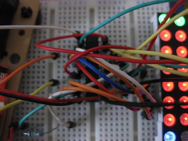2. calcular qué resistencia para usar. No soy un ingeniero o un electricista, y estoy también colourblind, por lo que he encontrado las marcas de resistencia absolutamente desconcertante. Usé sólo prueba y error hasta que encontre una resistencia que limita el brillo de la matriz hasta el límite de buena y no sople.