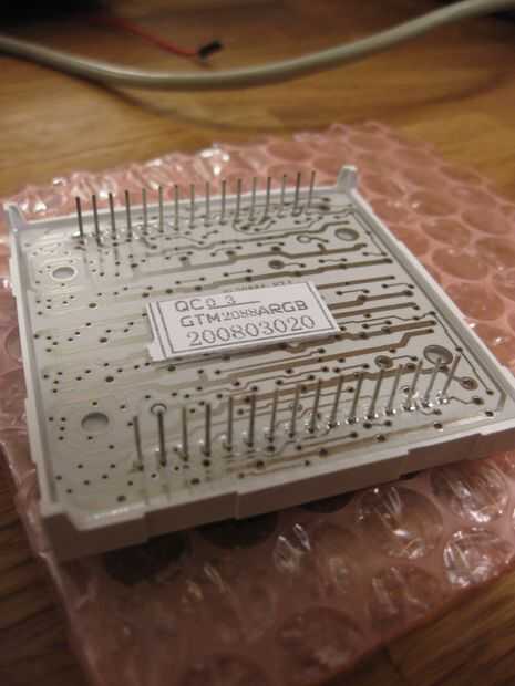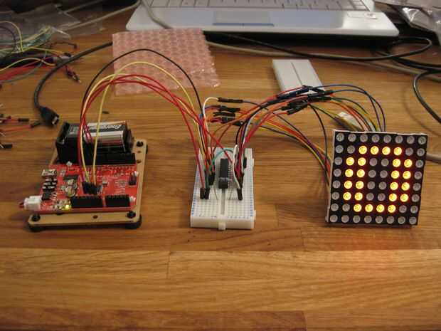 1. averiguar lo que hicieron los pasadores en la parte posterior de la matriz de LED. Se puede ver en la foto hay 32 pintas (8 para una fila, luego 8 para cada columna de color), no marcados con los números y la hoja de datos skpang vinculado a tenido algunos de los pernos invertidos. Escribí un pequeño programa para Arduino que ponga dos salidas alta por un segundo, luego baja para el próximo, repiten continuamente. Yo entonces apenas seguí tapando los cables directamente en la parte posterior del LED hasta que había averiguado de lo que hicieron los diferentes pines.