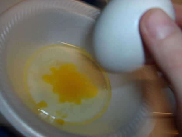 Asegúrese de que rompes la yema con un palillo o un pasador y golpe a través del agujero más pequeño para sacar las entrañas. Tenga cuidado de que no inhalar huevo crudo. Podría ser una buena idea para limpiar la tapa antes de poner su boca a él porque probablemente no sabe bien.