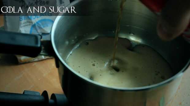 Vierta el azúcar en una sartén y derretir con un poco de cola, dentro de la cola hay una gran cantidad de colorante, que es una buena para este proyecto porque este color es el mismo de Dragonglass, la obsidiana.