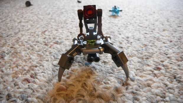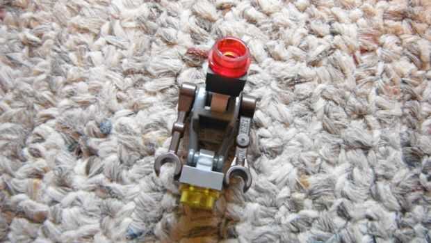 En primer lugar, coloque un poste redondo de 1 x 1 en la parte inferior de una placa de clip. Entonces, lo sujete la parte inferior del cuerpo del droide. A continuación, armar un poste transparente de 1 x 1 y la pierna esqueleto de Ninjago. Fije a donde el droide de normal "jefe" se encendería el cuerpo-esto servirá como el "ojo". Ahora, poner 2 brazos de droides en el cuerpo del droide. Después de eso, poner el cuerpo en las piernas apretando el 1 x 1 en el clip entre todos 4 pernos en la placa de octo, pero asegúrese de que usted ejerza. Entonces debería verse como la imagen final.