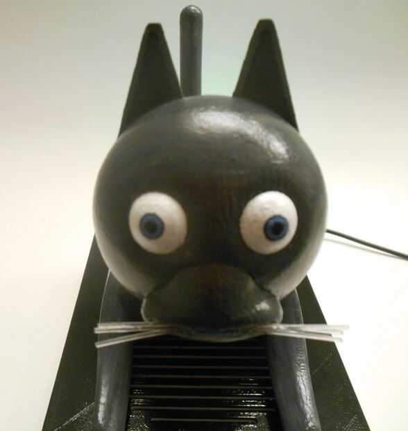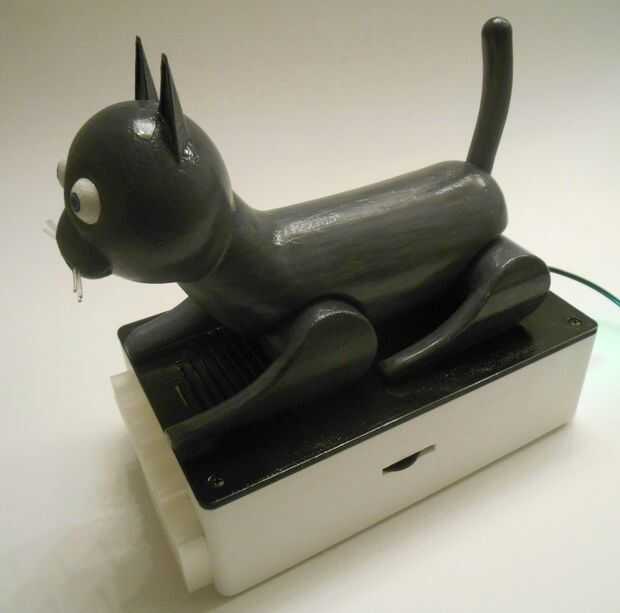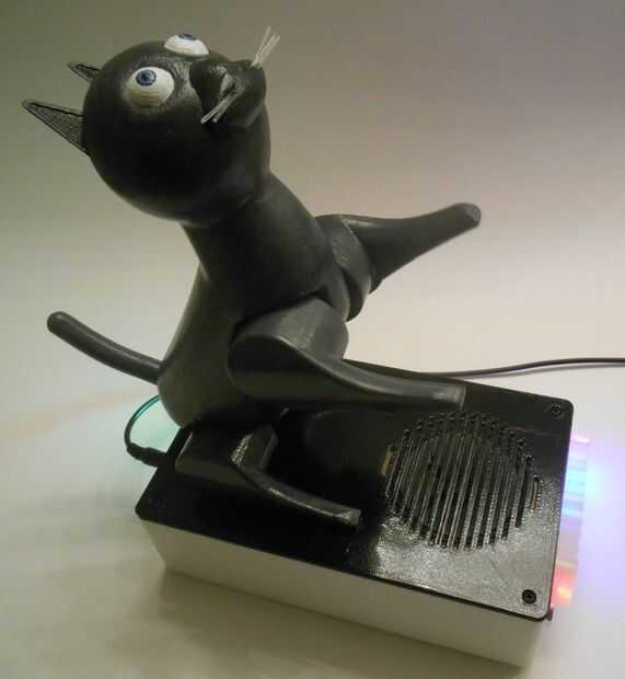 Este es mi proyecto, titulado "Dubstep Kitty." Hay un sensor de proximidad situado en la parte frontal de la caja. Cuando hay un cambio es la distancia de aproximadamente 2 pies, luego un sonido de "Miau" que emanaba de Dubstep Kitty. Para aclarar, esto significa que cuando alguien camina delante de Dubstep Kitty, Dubstep Kitty se activará, por lo que el "maullido" sonido una vez. En la activación de la quinta, en lugar de "Miau-ing", música Dubstep (electrónico) comenzará a jugar, y el cuerpo de Dubstep Kitty levantará cerca de 80 grados (ver la imagen encima). Los LEDs en la etiqueta de Dubstep Kitty claro en la parte frontal de la caja se encenderá y comienzan a parpadear. Los brazos de Dubstep Kitty también empezará a bailar, vía va hacia arriba y hacia abajo en un patrón alterno (un brazo sube mientras el otro brazo va hacia abajo). Después de los 20 segundo clip de música y danza ciclo termina, Dubstep Kitty se restablece. Así, Dubstep Kitty será entonces "Miau" cuando alguien camina por (según lo mencionado previamente). Sin embargo, una cosa que note es que 8 clips de la canción diferente se cargan en Dubstep Kitty. Así, cada vez que baila a la música, no será la misma canción repetitiva. Por motivos legales, no puedo subir los clips de la canción. También estoy contra la piratería de archivos de música y tal. Sin embargo, tomar esto como una oportunidad para personalizar Dubstep Kitty añadiendo tus propios clips de música!