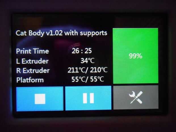 Imprimí mis partes a quizás una velocidad más lenta de la velocidad de impresión 100mm/s y velocidad de recorrido de 120mm/s. Así, esto combinado con la 80 micras capa resolución terminada requiriendo mucho tiempo para las impresiones. El cuerpo del gato a las imágenes por encima de por ejemplo, tomó alrededor de 28 horas para imprimir. Estaba en no hay apuro, y quería obtener los mejores resultados que he podido. Puede experimentar con resoluciones más altas y más rápido imprimir veces si usted considere apropiado.