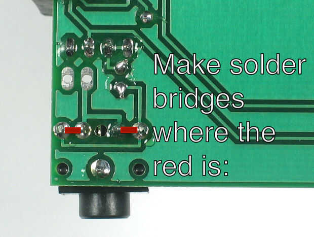 Prueba el protector de la onda de Adafruit que me di cuenta de que la salida del altavoz se apaga cuando un 1/8" conector hembra es herramienta de inserción a la salida de audio en el escudo. Este es un problema que no planeaba tener el protector de la onda y Arduino cerca de la parte posterior de la caja. Por lo tanto, al estudiar el esquema llegué a 2 opciones. Opción #1 sería comprar e instalar un 1/8" hembra puerto de audio que no tenían esta característica. Opción #2 sería conectar los nodos etiquetados en la parte superior derecha del esquema 2 y 3 juntos y para conectar los nodos 4 y 5 juntos así. Ver la imagen arriba para verlo que parece en el circuito. En este punto tienes 2 opciones más. Puede soldar los cables para conectar los nodos, o usted puede hacer lo que hice: acaba de hacer 2 puentes de soldadura.