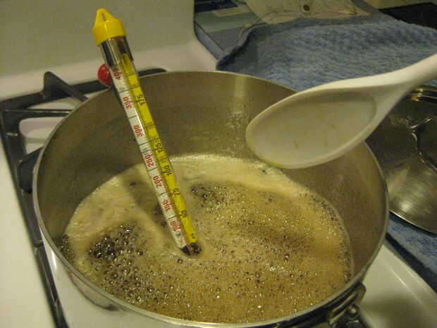 • Hervir fuego fuerte sin revolver hasta que la temperatura del jarabe hirviendo alcanza un punto que es 32 grados F por encima del punto de ebullición del agua (éste era el propósito de encontrar el punto de ebullición del agua).  No deje el cocinero jarabe durante demasiado tiempo o se quema, que no es bueno (especialmente para cuánto tiempo tomó hacer).
