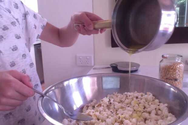 Vierta la mantequilla y el azúcar de la mezcla sobre las palomitas y revuelva uniformemente a través de.