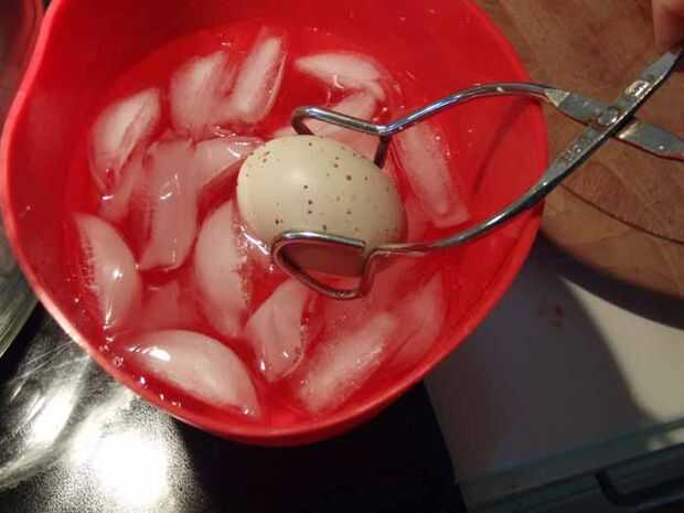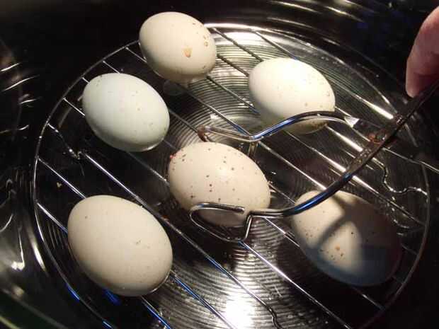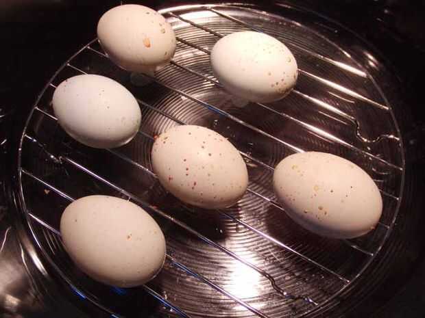 Cuando se cuece al horno huevos como este, las cáscaras acumularán pequeños pedacitos de grasa si tu horno no está impecablemente limpio. (Que mina al parecer no era.) Pero estos puntos son fáciles de quitar con un poco de enjuague.