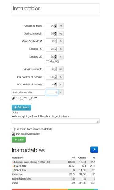 Para este escribir me voy a hacer con una fuerza de nicotina 36 mg 30ml. Yo tambien quiero la mezcla a una mezcla de 70pg y 30vg usando aromatización de 5%.