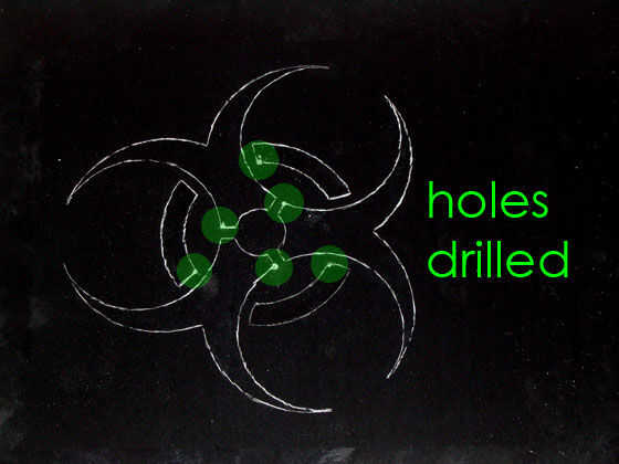 Decide donde va a taladrar un agujero o agujeros en el plástico para enhebrar EL alambre a través, de la parte posterior y taladrar los agujeros. Los agujeros deben ser aproximadamente del mismo tamaño como EL alambre. Para este proyecto, encontré que un 1/16 de pulgada broca funciona perfectamente para el cabello de Ángel de 1,2 mm. (Descubrí taladro de 1/16 de pulgada pedacitos se pueden romper fácilmente, por lo que usted tiene que parar lo que está haciendo y va a la tienda de hardware.) Obviamente, usted quiere el agujero para ser tan pequeño como sea posible, mientras sigue permitiendo que EL alambre pase a través de él, porque no desea que el agujero sea visible. Algunos diseños pueden requerir varios agujeros, como las que requieren más de un color de alambre. El proyecto biológico requiere seis cables / seis orificios.