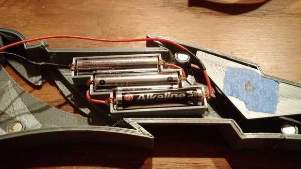 Montaje de pilas en el arco resultó para ser un desafío. Terminé haciendo un soporte de la batería personalizada y cableado junto con secciones de alambre 22ga. Usé una tira de cinta aislante para sujetar en su lugar. La bandeja está conectada a través de un par de imanes en la parte inferior. Esto facilitará cambiar baterías.