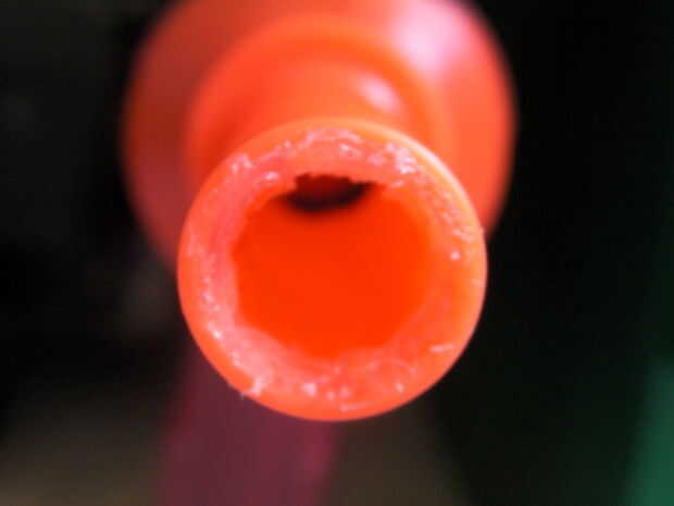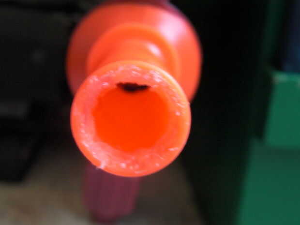 interior del cañón, sobre en línea con las protuberancias le grinded abajo. Si accidentalmente utiliza demasiado pegamento, y dardos ya no cabrán en el cañón, utilice la boquilla de la pistola de pegamento caliente para disipe moviendo la boquilla en el interior del cañón en un movimiento circular, tocar los lados. Se debe terminar como este, si no mejor. Tratar de que el pegamento incluso todo el interior, ya que el barril gira, y que puede deshacerse de sus calibraciones.