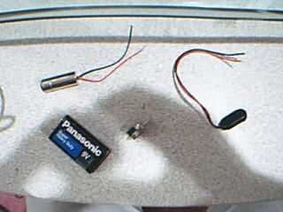 1) 650nm 5mw 12X30mm latón caso $4,50 de AixiZ (laser plumas no funcionarán!) 2) un interruptor de encendido/apagado de Radio Shack---$1,99 3) un clip de 9 voltios de Radio Shack---5 por $2.99 4) una batería de 9 voltios 5) una pistola de tek de clip