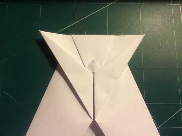 Doblar los pliegues anteriores a lo largo de los pliegues existentes como se muestra, luego tire del papel saliente detrás del pliegue del centro. Repita en el otro lado. Tire de la punta de la nariz hacia atrás hasta que sus puntas satisfacer los vértices del diamante; luego doble los bordes del papel debajo de las otras capas como se muestra después de tirar de la parte saliente hacia atrás hacia adelante.