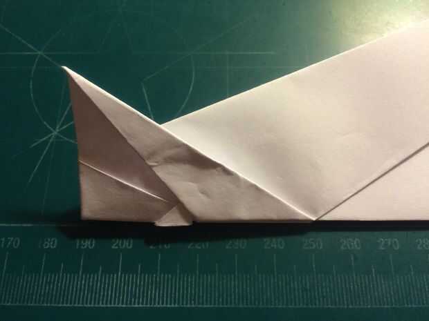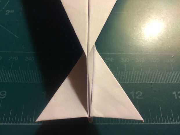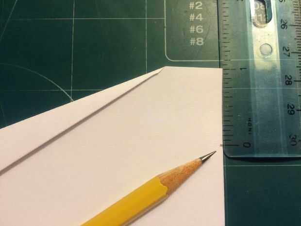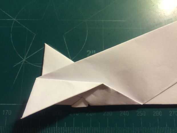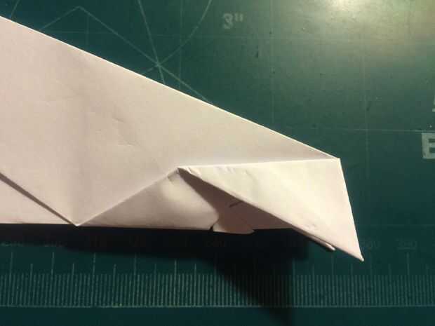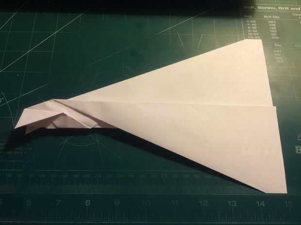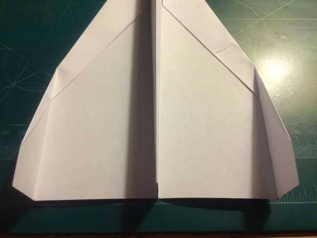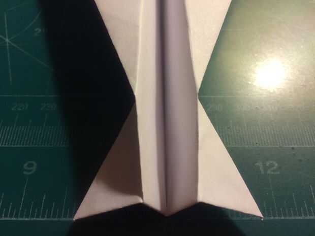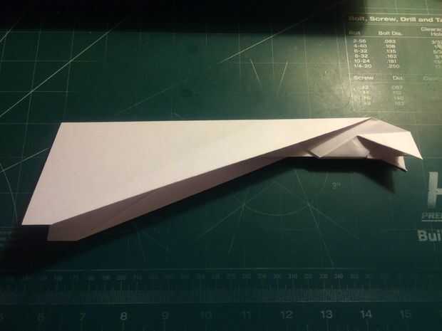 Doble su avión de papel por la mitad a lo largo de su centro. Doble los canards hacia abajo como se muestra, alineando su borde de ataque con el fuselage mantenga un ángulo de incidencia de cero grados. Medida 1 pulgada hacia arriba a lo largo del borde posterior desde el pliegue de centro y 1 pulgada hacia adentro de la punta del ala a lo largo del borde posterior. Una vez hecho esto, pliegue las alas hacia abajo en la marca de 1 pulgada que hiciste anteriormente. Después de esto se ha completado, doblar cada aletilla en el punto de 1 pulgada que hiciste anteriormente. Después de las aletillas, aplique cinta de designado. Esto completará tu AeroDagger.