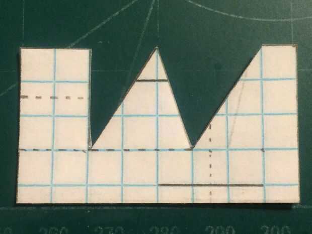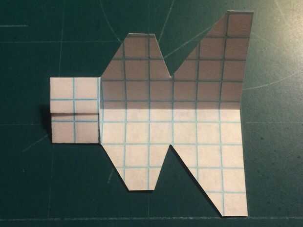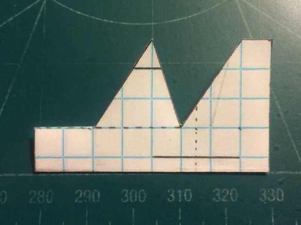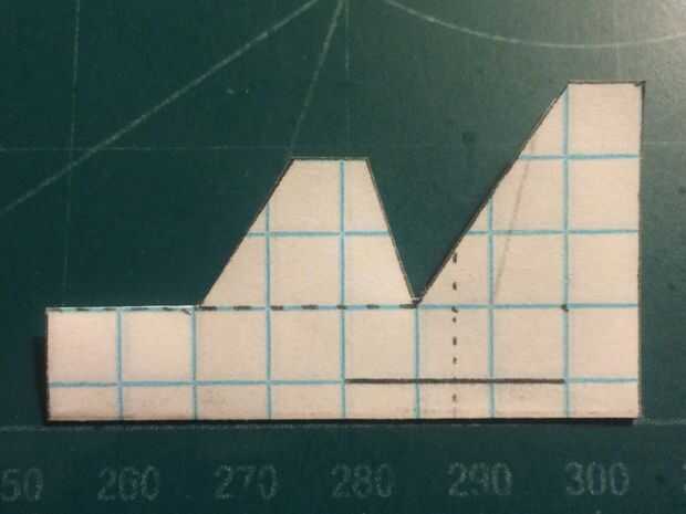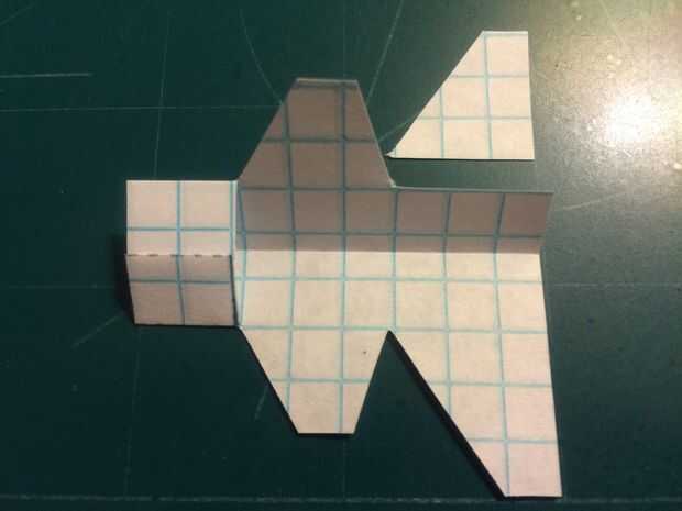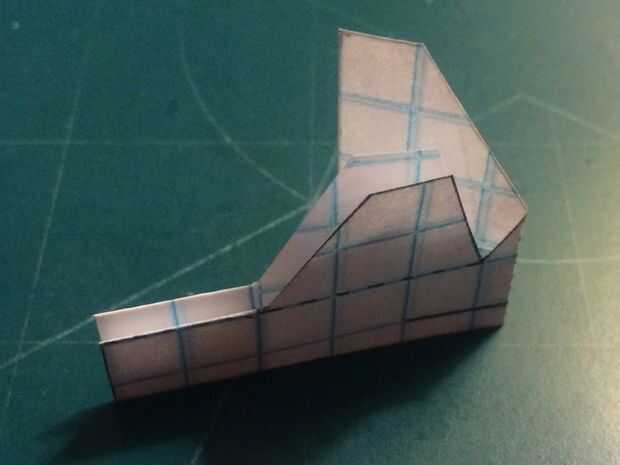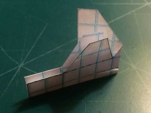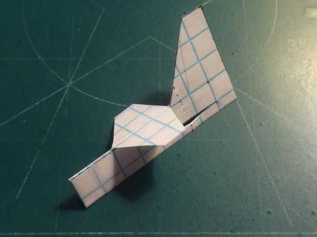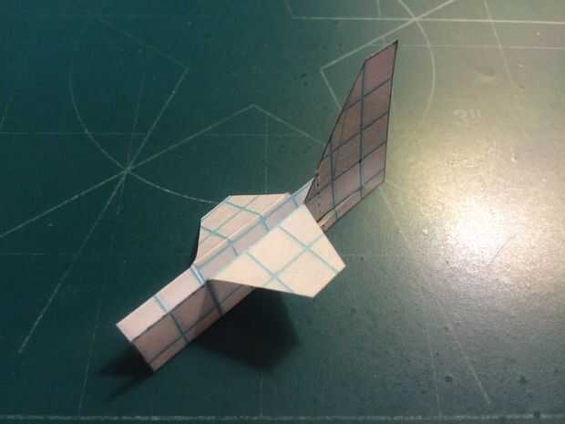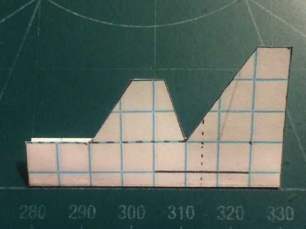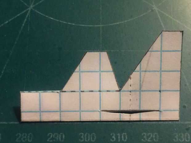 Cortar el fuselaje y doblar sus contrapesos en el fueslage. Cortar las porciones que sobresalen como se indica, luego corte la aleta vertical extra. Una vez hecho esto, doblar a lo largo de la línea de puntos vertical y corte a lo largo de la línea horizontal continua. Una vez realizado el corte, deshacer el doblez y cinta de designado.