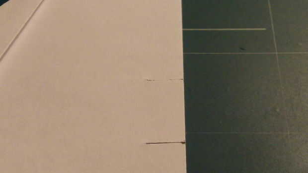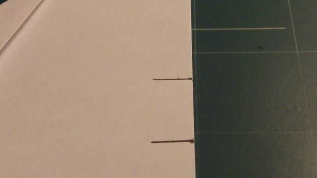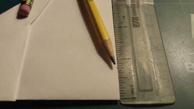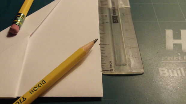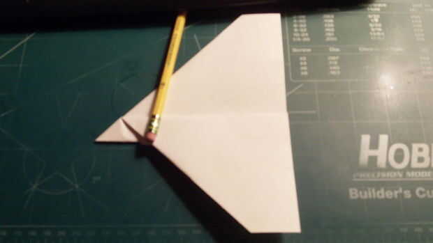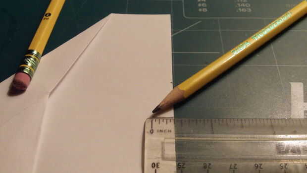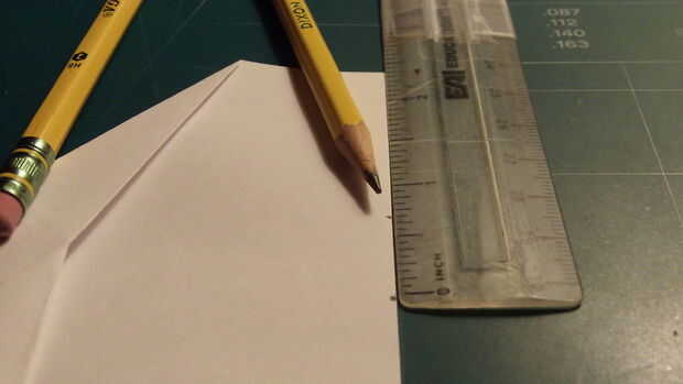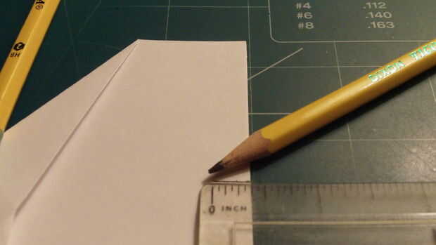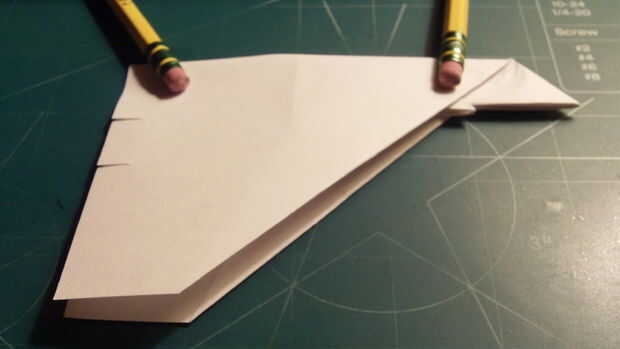 Empezar a hacer tus ascensores 0,75 pulgadas por encima del pliegue del centro y haciendo una marca. Se trata de Dónde está la raíz del ala. De esta marca, medir una pulgada de la pulgada más hacia arriba a lo largo del borde posterior y haga una marca. Luego se mide otro 0,75 pulgadas de esta marca. De estas dos últimas marcas Mida hacia la parte delantera del ala de 0,375 pulgadas y hacer líneas de esta longitud. Una vez que estas líneas son, corte a lo largo de ellos. Una vez realizados los cortes, pliegue las alas hacia abajo en la primera boya como se muestra, en paralelo con el borde posterior del fuselaje.