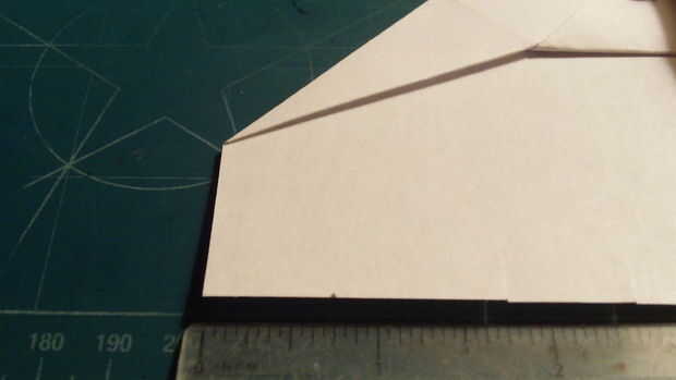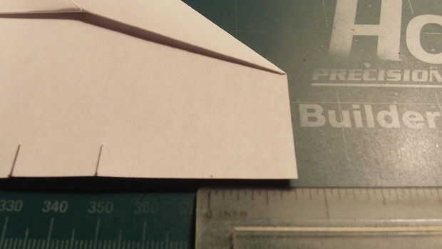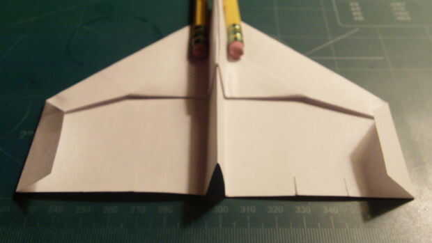 Mide 0,75 pulgadas hacia adentro de cada extremo del ala y hacer una marca en cada uno de estos puntos. Luego doblar en estos puntos para hacer las aletillas. Una vez que las aletillas se doble la nariz hacia atrás como se muestra, cinta luego de designado. Doblar los elevadores hasta el ~ 45 grados de deflexión. Esto completará tu AeroSpectre.