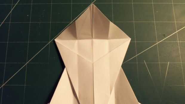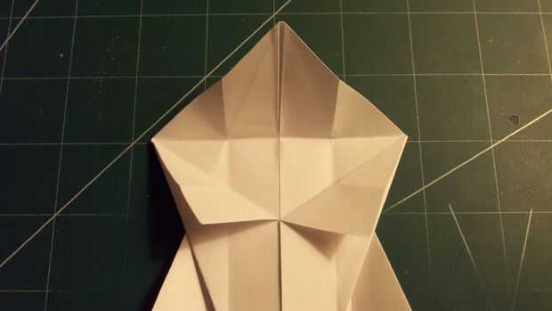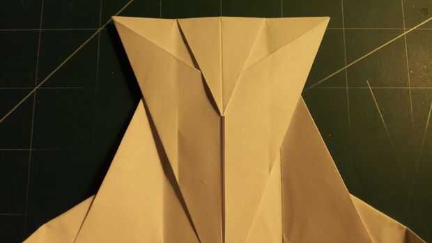 Una vez hecho esto, aplanar la armadura de avión entera y desdoblar el pliegue triangular de la nariz. Doblar los bordes del centro de los canards hacia sus bordes, y luego después de hacer pliegues, métalos por debajo de los dobleces como se muestra. Después de esto, restaurar el pliegue triangular y deslice las aletas canard en el pliegue de la nariz triangular como se muestra.