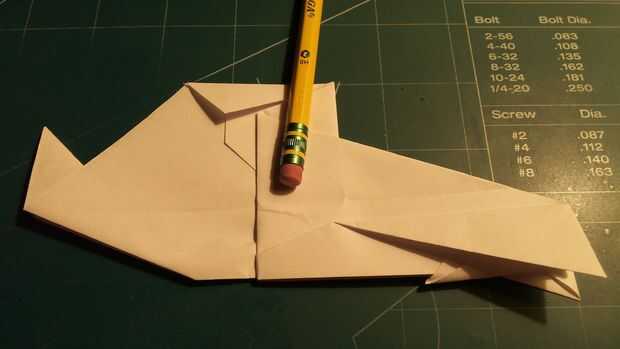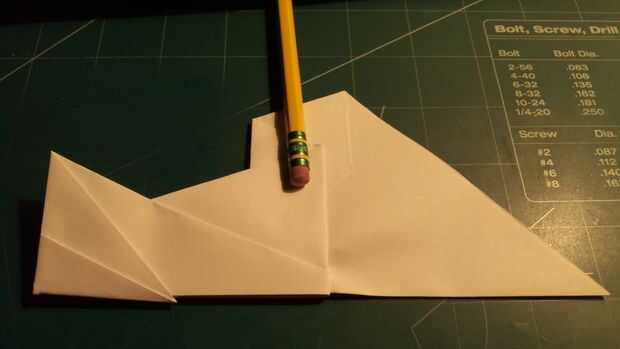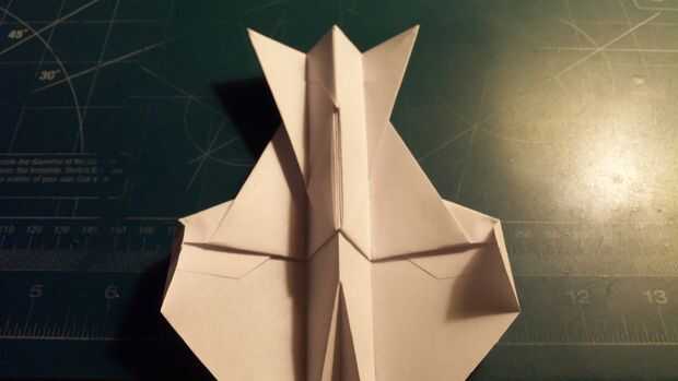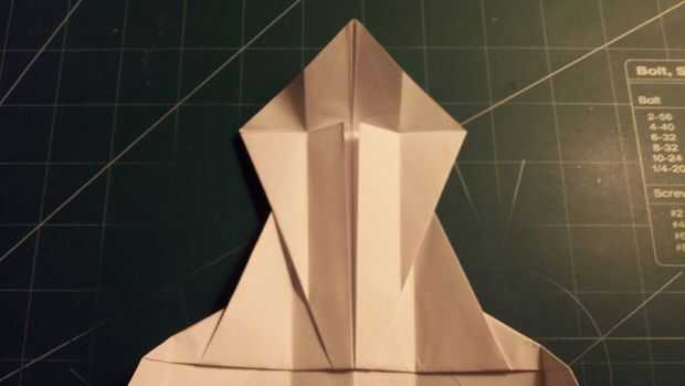 Fold down the canards as shown. Medir 0,875 pulgadas por encima del doblez de centro en el borde de fuga y haga una marca. De esta marca, dobla las alas hacia abajo paralelo con el doblez del centro de la aeronave. Desplegar las alas después de hacer los pliegues, luego doblar la cola para arriba como se muestra. Una vez haya hecho el pliegue, despliegue del avión y luego tire de la cola a través del fuselaje. Medir 0,625 pulgadas desde la punta del ala a lo largo del borde posterior de las superficies de sustentación, luego doblar las aletillas paralelo al fuselaje después de doblar los bordes de ataque hacia el interior y bajo el pliegue de la nariz como se muestra.