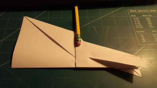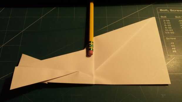 Comenzar este paso tirando hacia atrás de la nariz hasta el borde de la nariz toque el borde de fuga del ala. Haga una marca 0,75 pulgadas de este redil. Luego invierta el doblez hasta esta marca. Desplegar este nuevo pliegue, luego tire de los extremos hacia adentro como se muestra. Una vez que se doblan una vez vuelva a tirar la nariz adelante. Con esto hecho, doble el fuselaje por la mitad a lo largo del pliegue del centro. Hacer marcas de 1 pulgada desde el pliegue de centro y 1 pulgada de la punta del ala a lo largo del borde posterior del ala. Doble hacia abajo las canards mientras mantienen sus bordes principales alineados con la nariz para mantener un ángulo de incidencia de cero grados. Después de esto, plegar las alas en la marca que hiciste anteriormente. Alinee los bordes de fuga de las alas con eso del fuselaje para mantener el ángulo de incidencia a cero grados. Después de que esto termine, doble los extremos hacia abajo en las marcas realizadas anteriormente.