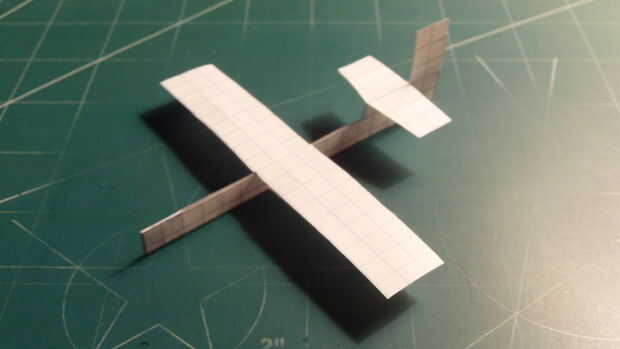 Ahora es el momento para trabajar con su ala. Corte hacia fuera a lo largo de sus líneas como se muestra. Aplicará el fuselaje a la parte inferior de la hoja con cinta adhesiva. Corte cualquier exceso. Una vez que el ala en su lugar, voltee el aeroplano, desplegar el tren de aterrizaje y añadir dos grapas a la parte frontal (sobre el pliegue del contrapeso).