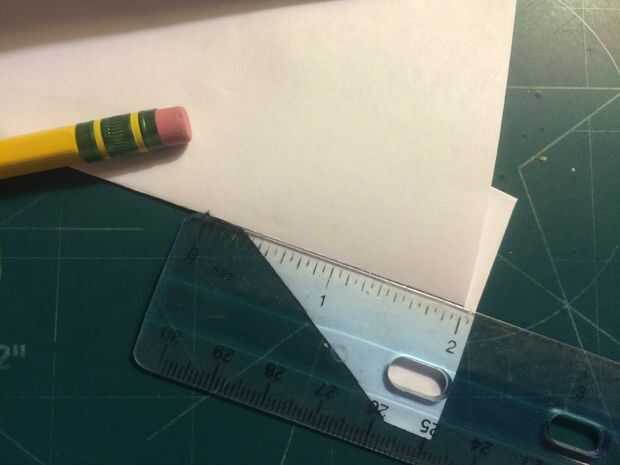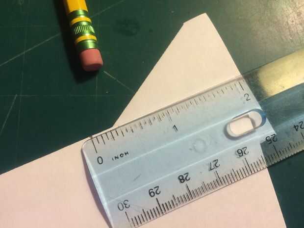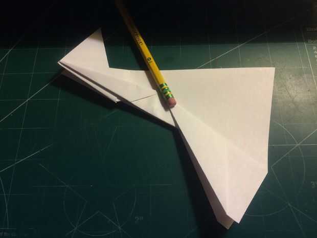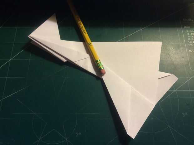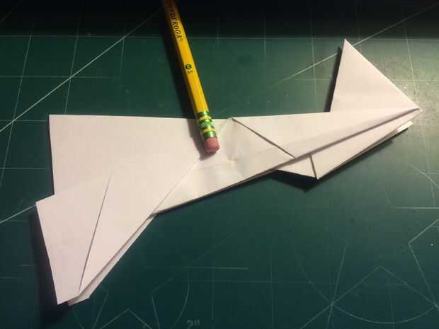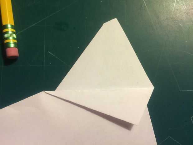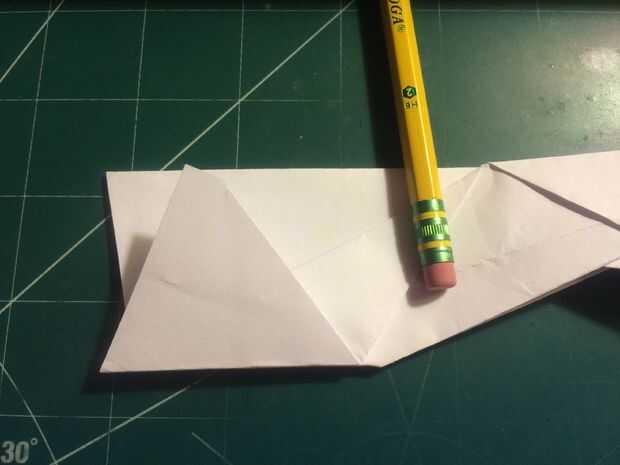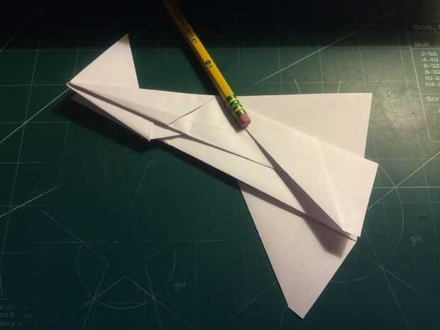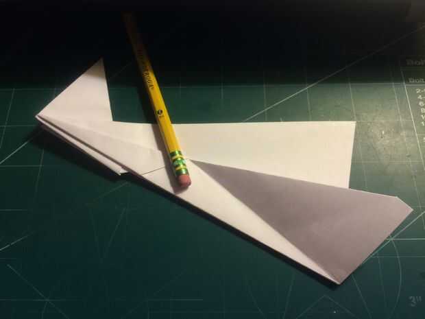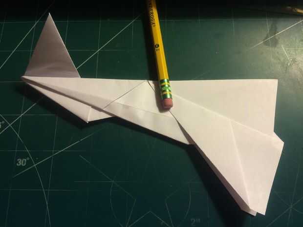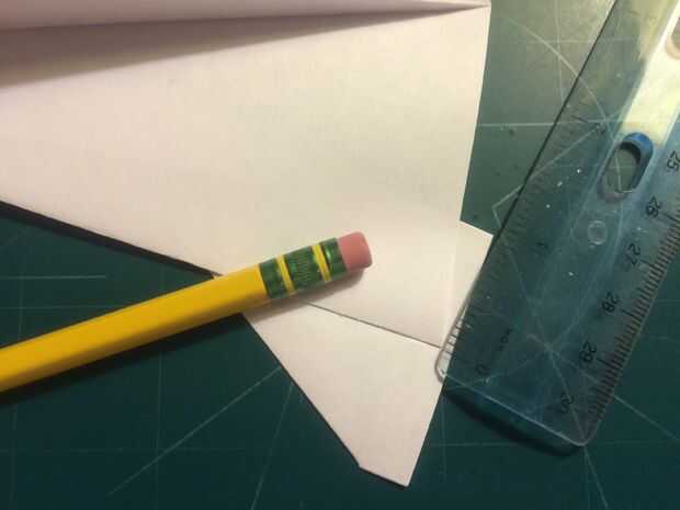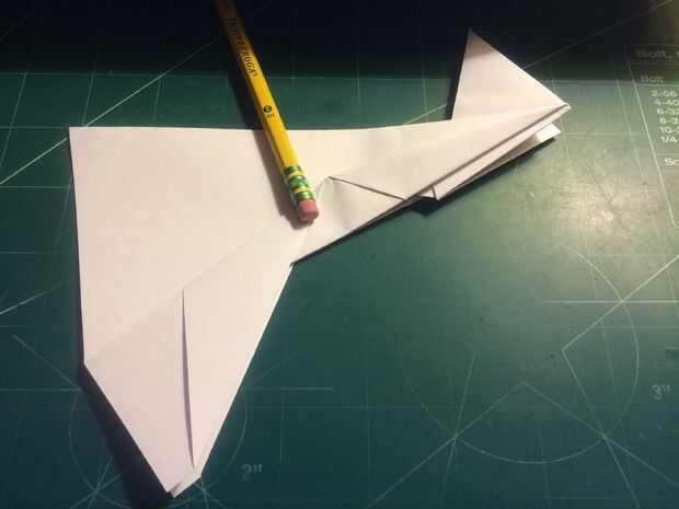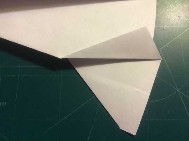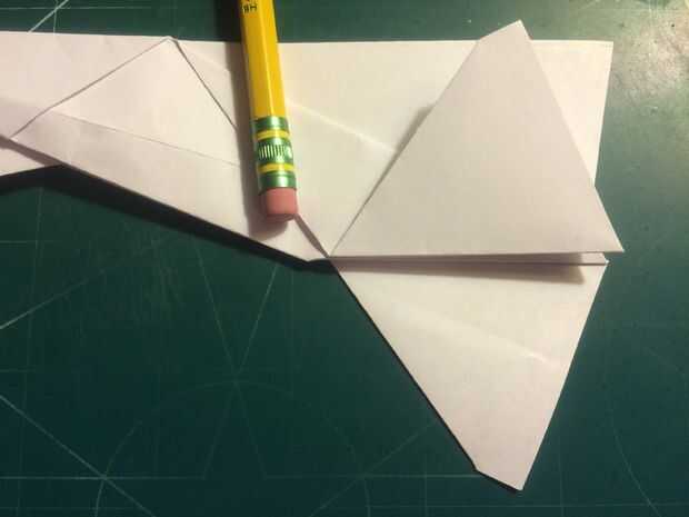Doble la parte colgante del ala entre la punta del ala y la sección doble de la superficie como se muestra y pliegue, luego repita al otro lado. Después de hacer esto, tire la tapa de superficie de sustentación en hacia el ala pliegues de raíz como se muestra. Plegar el doblez de seguridad sobre la nariz para hacer plegable se encargará de en el paso siguiente. Medida de 0,875 pulgadas a lo largo del borde posterior de la aletilla ventral (esto debe corresponder a su longitud) y 2 pulgadas a lo largo de su borde de ataque para hacer una marca. Conectar la marca y el borde de la aletilla con un pliegue. Repita en el otro lado con las mismas medidas. Para doblar las aletillas dorsales, alinear sus pliegues con los de las aletillas ventrales.