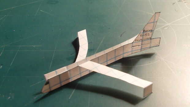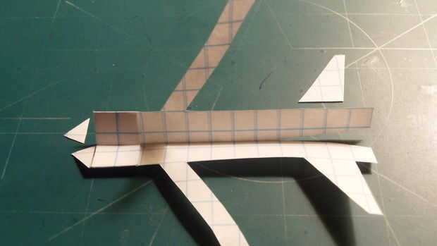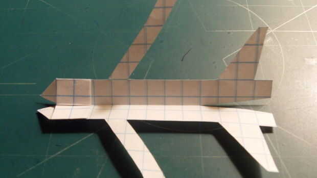 Empezar a hacer el fuselaje lo cortando y doblando los contrapesos. Proceder para luego desplegar el fuselaje y corte la sección de derecho de la nariz adelante del contrapeso y el timón derecho. Entonces puede deshacerse de estas piezas. Alrededor de la nariz cortar una pequeña parte de él como se muestra. A lo largo de la línea punteada vertical, doble del fuselage posterior hacia adelante y corte a lo largo de la línea sólida horizontal. Una vez hecho esto, se despliegan. Con este hecho, la cinta de designado.