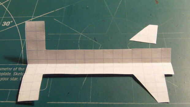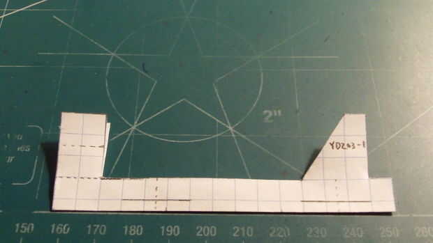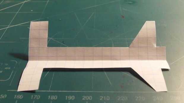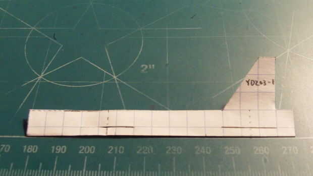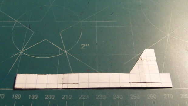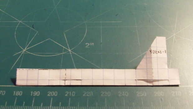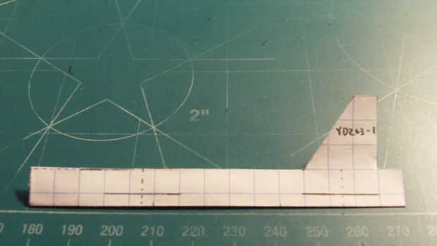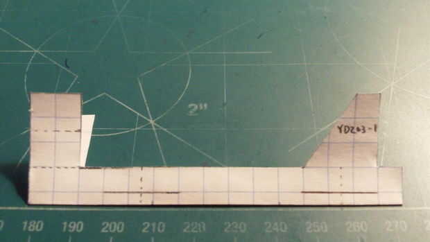 Corte fuselaje su ascendente a lo largo de las líneas sólidas externas como se muestra. Doblando el contrapeso en el fuselaje como se muestra. Doble el fuselaje por la línea punteada en el fuselaje y corte a lo largo de la línea. A continuación se despliegan. Doble a lo largo de la línea punteada del timón y corte a lo largo de la línea. A continuación se despliegan.