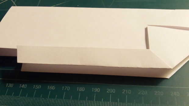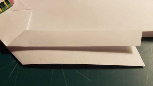 Doblar las aletas ventrales hasta la parte inferior del ala y entonces doble las alas hacia abajo. Luego doblar los extremos del ala para arriba sus bordes a los extremos de los cortes de la aleta ventral.