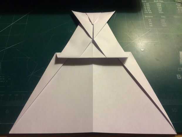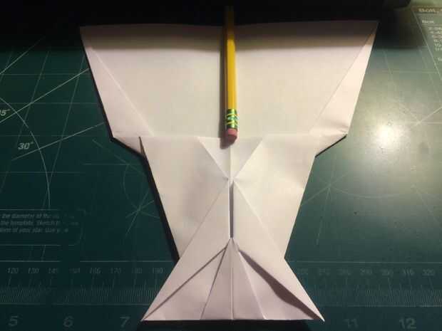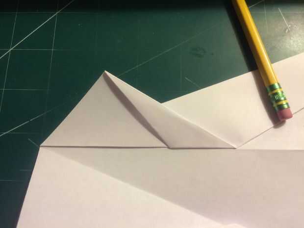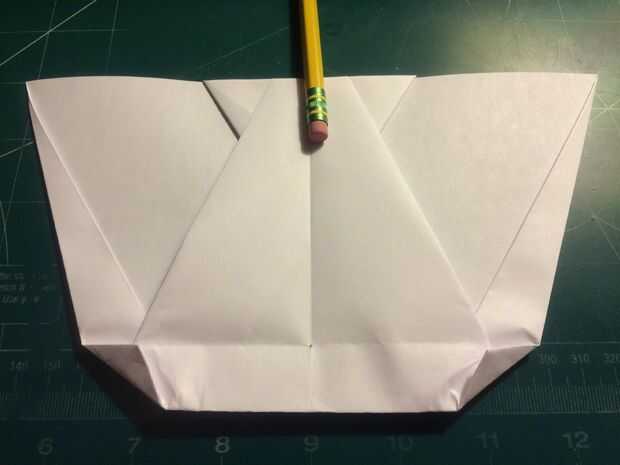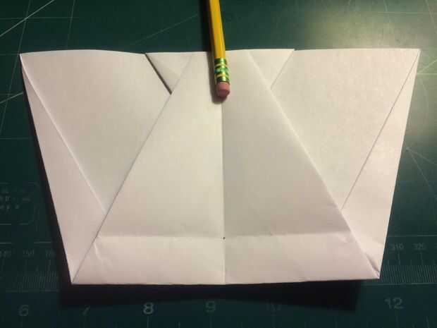 Doblar los pliegues anteriores a lo largo de los pliegues existentes como se muestra, luego tire del papel saliente detrás del pliegue del centro. Repita en el otro lado. Tire de la punta de la nariz hacia atrás hasta que sus puntas cubrir el ápice del diamante; luego doble los bordes del papel debajo de las otras capas como se muestra. Después de esto, tire la punta ahora Roma del papel hasta el borde de salida del papel. Una vez hecho esto, mide 0,75 pulgadas desde el pliegue resultante y haga una marca. Proceda a continuación tire del papel hacia adelante otra vez y pliegue en la marca como se muestra. Después de hacer el pliegue, deshacer el doblez y doble los bordes del papel hasta el pliegue. Vuelva a tirar la nariz hacia adelante para cubrir estos nuevos dobleces.