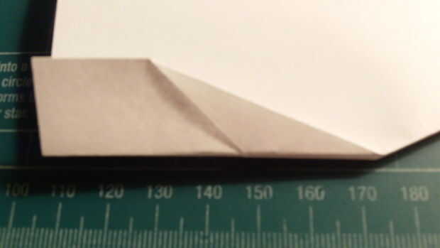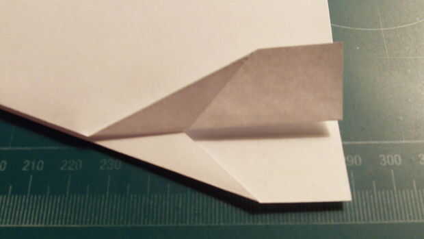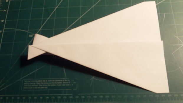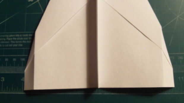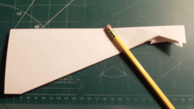 Iniciar este paso doblando su daga por la mitad a lo largo de su longitud. Luego doblar el ala abajo 3/4 de pulgada por encima del pliegue del centro, con los bordes de fuga paralelo. Una vez que ambos se pliegan, doblar las aletillas encima 3/4 de pulgada en de los extremos del ala (mantener los bordes de fuga de las aletillas paralela a la del ala también). Después de haber hecho pliegues, invierta los pliegues para que las aletillas están debajo del ala con el fuselaje.