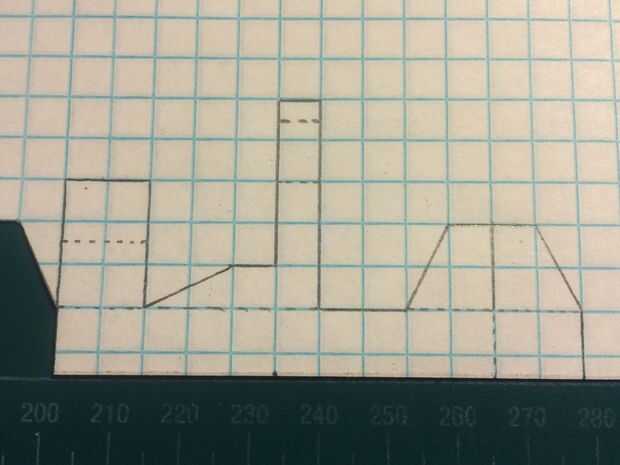 En primer lugar, comenzar por plegamiento eres tu papel milimetrado en la mitad (excepto tres cajas en el lado perforado). Una vez que el papel ha sido doblado adecuadamente, haga dos marcas--12 cajas completos apart (permite un cuadro más detrás de la armadura de avión). Use una regla para hacer una línea recta con una longitud de 12 cajas directamente a 1 fila de cajas de las dos marcas que acaba de hacer. Luego realizar los estabilizadores, largueros y contrapeso como se indica. Para evitar confusiones, se ha omitido una línea que se corta a lo largo de la fotografía.