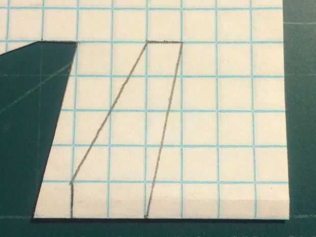 Después de que el fuselaje se hace, tomar otra hoja de papel que se dobla por la mitad a lo largo de las líneas de cajas. Marcar el ala como se muestra (2 cajas de acorde a la raíz, por 5 cajas de ancho, con un movimiento de vanguardia de 1 caja de acorde eliminaron cada 2 cajas de la raíz del fuselaje y un borde posterior barrido de 1 caja de acorde cada 5 cajas de la raíz). Luego cortar el ala.