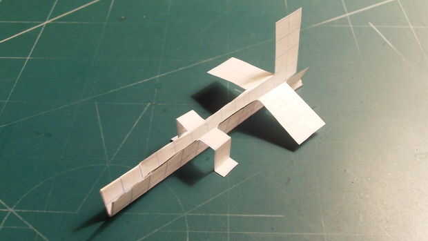 Después de haber cortado todo el fuselaje. Comenzar a doblar por la línea punteada. Después de haber doblado las líneas correctamente, debería aparecer como se muestra en la segunda foto. Luego de la cinta su fuselaje juntos en los lugares conocidos en la fotografía.