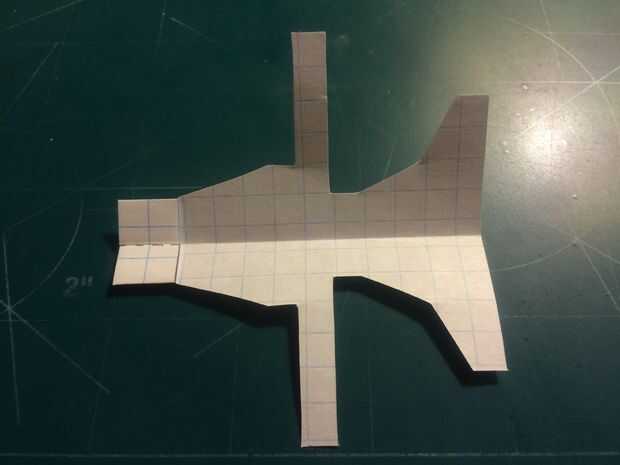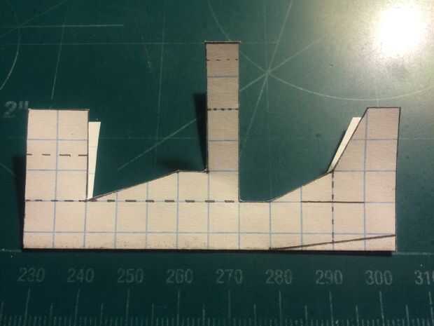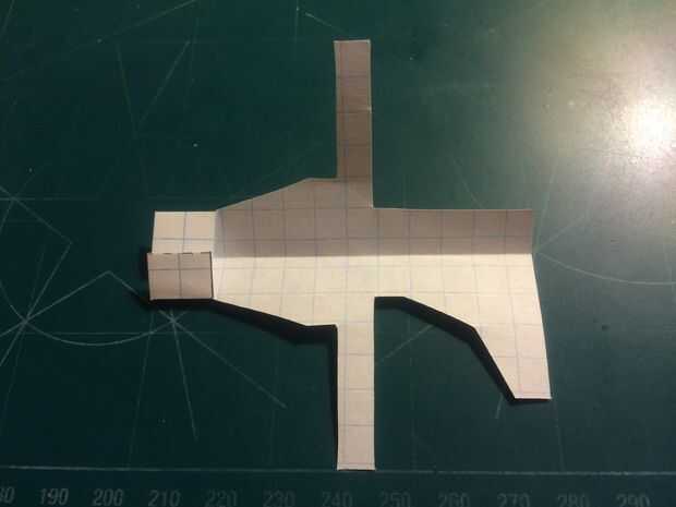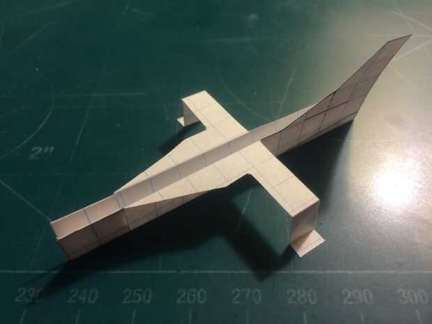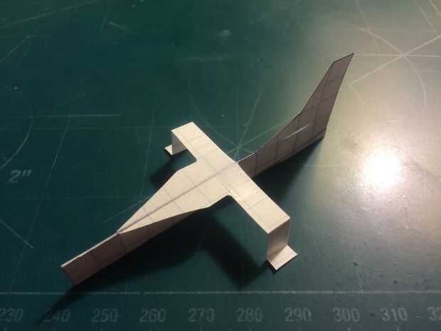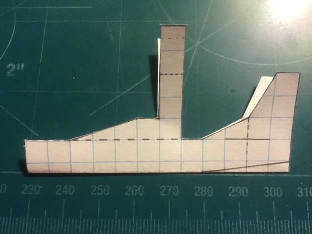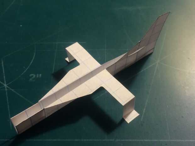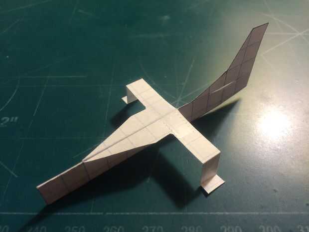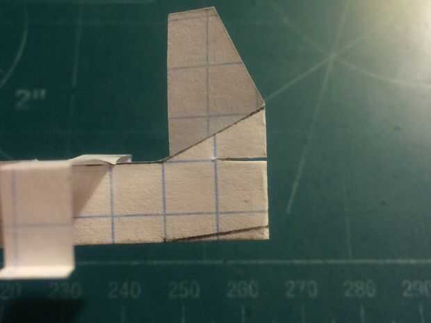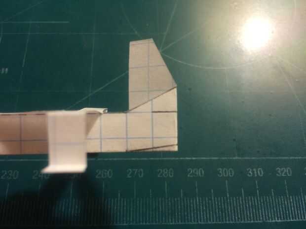 Cortar el fuselaje y doblar el contrapeso en sí mismo, como se muestra. Luego desplegar el fuselaje y corte el estabilizador vertical derecha. Entonces restaurar el pliegue. Doblar el fuselaje hacia adelante en la línea punteada vertical en el estabilizador vertical. Una vez haya hecho el corte a lo largo de la línea sólida, se despliegan. Una vez hecho esto, se abaten las perchas y patines. Luego aplique cinta de designado. Corte ahora a lo largo de la línea diagonal en la quilla de la armadura de avión.
