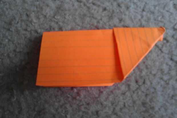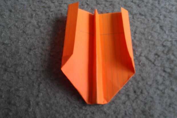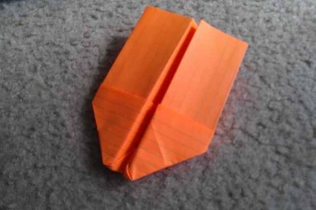 Doble el papel por la mitad con todos los pliegues anteriores en la parte superior. A continuación, plegar las alas. Por último, doble aletas mirando hacia abajo esta vez. Esto crea exceso de carga aerodinámica y también ayudar a que la bomba caiga más suavemente.