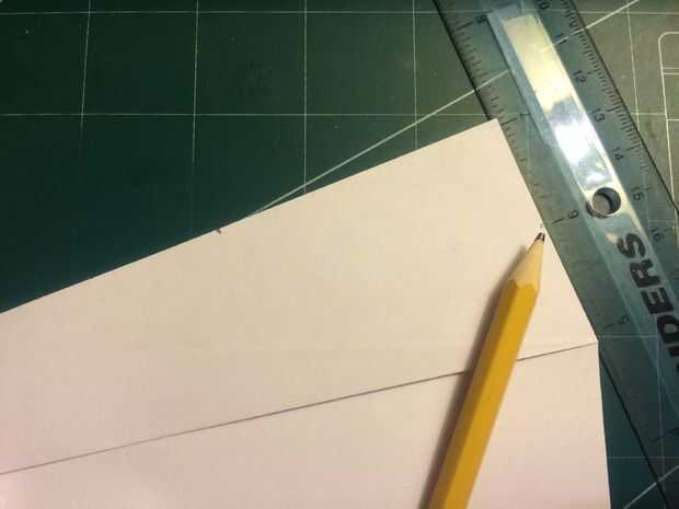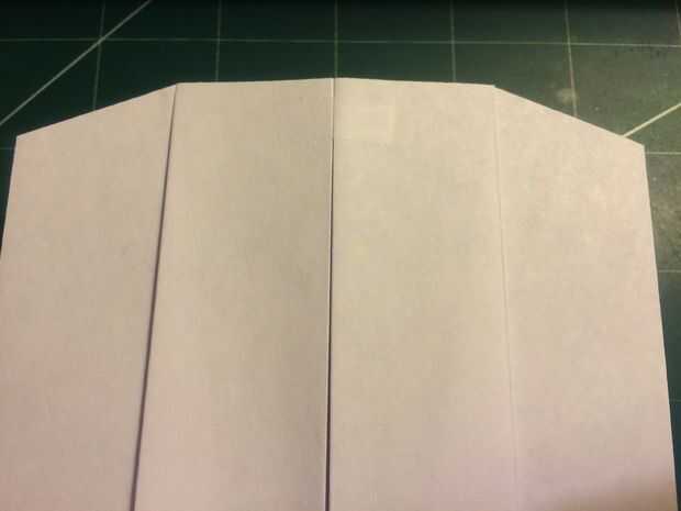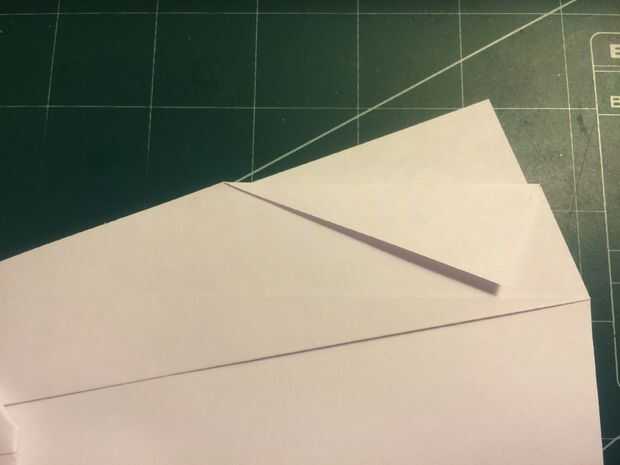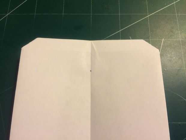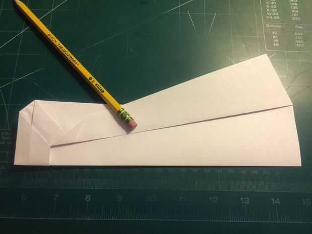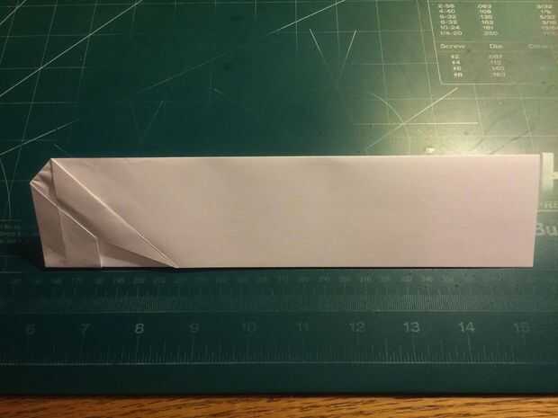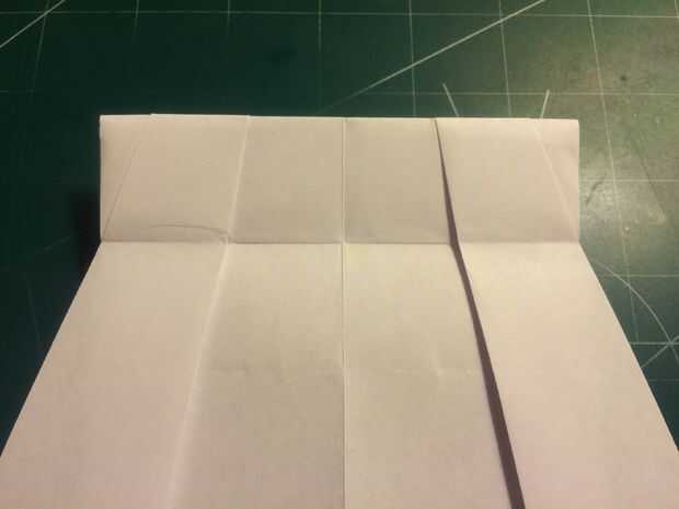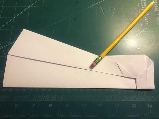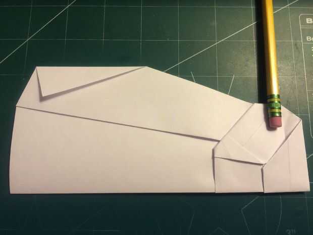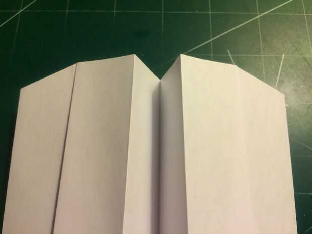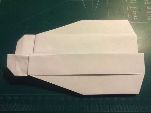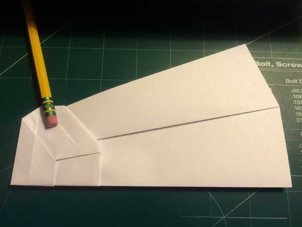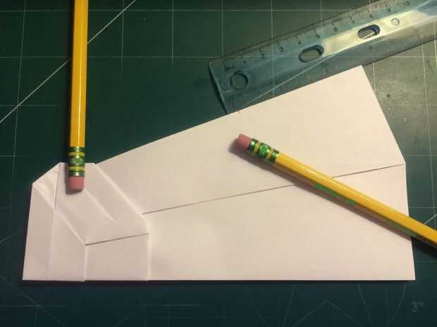 Medir 2,625 pulgadas del extremo del ala a lo largo del borde principal y haga una marca. Mide 1 pulgada de la punta a lo largo del borde posterior. Doblar los extremos del ala en aletillas para conectar estas dos marcas en cada lado con pliegues. Baje las secciones de ala interna sobre la parte superior del fuselaje y pliegue cuando sus bordes encuentran que el fuselaje en el pliegue del centro.