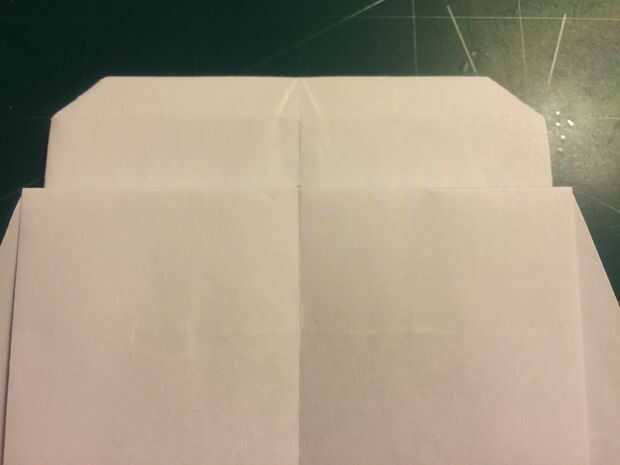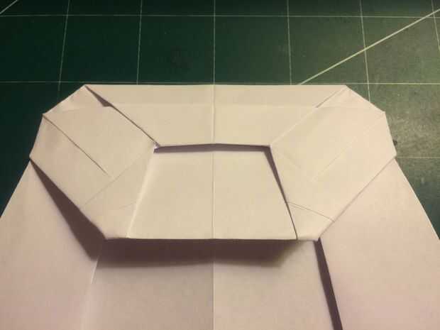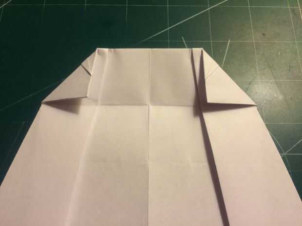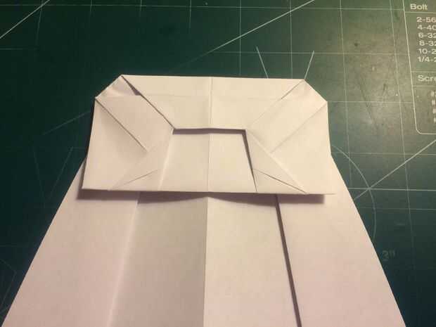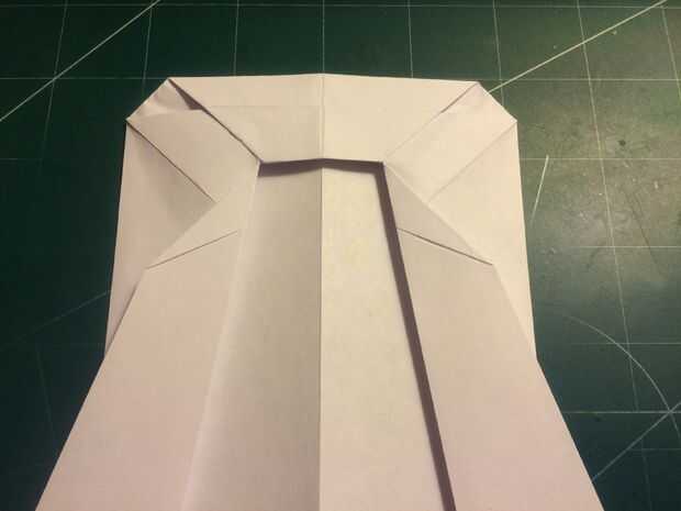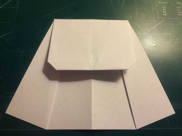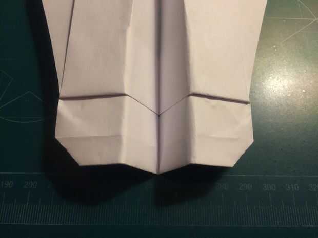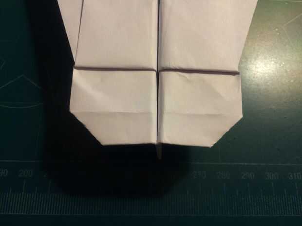 Tire los pliegues cuarto externos hacia afuera entre sus límites en el pliegue de la nariz y bordes de fuga/posterior de cada lado. Después de hacer esto, marque el borde trasero de la tapa de la nariz en el lado opuesto. Tirar de la nariz hacia donde sobresalen los cuartos exteriores; después de hacer esto, tire la nariz vuelta hacia adelante hasta que la marca previamente es el límite posterior de los pliegues de la nariz visible en el lado dorsal. Tapa la nariz hacia adelante (brevemente deshacer el primer pliegue de la nariz) y doblar las esquinas hacia adentro, luego restaurar los dobleces de la nariz.